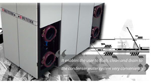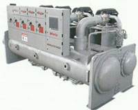 MULTISTACK Water Cooled Chillers are designed and constructed under the modular technology patent. A chiller bank consists of multiple individual chiller modules connected in parallel to operate as a single machine, with cooling or heating capacity to match the load demand by varying the number of operating modules. The chiller modules start from one module to fiteen for MSCW210 while the MSCW445/485 has a maximum of ten (VWF models has a minimum of four modules), giving you full flxibility to increase the capacity as your needs increase. Each module contains a screw compressor, evaporator, condenser, and sophisticated control and protection equipments. Each module operates as a completely independent refrigeration circuit, and varying to the total load demand. The controller will change the chillers capacity by either controlling the number of modules in operation or by adjusting the capacity of the last start up compressor. The chiller is enclosed within an attractive but also sturdy frame and has removable doors for easy access and convenience for maintenance and service. The doors can be lined with acoustic insulation, which further silences the chiller. (optional) Screw Compressor Each module contains a high effiency semi-hermetic screw compressor. The refrigerant drawn into the compressor flws evenly over the motor sealed inside the compressor case, and cools down the motor thoroughly. This ensures the motor is always working at the ideal temperature condition. The built-in protection part continually monitors the coil temperature via 6 PTC pre-fi in the coil. The compressor will shut down if abnormal temperature is detected. The compressor has three stage capacity controls: 50%, 75%, 100%. This is accomplished through a slide valveregulating mechanism. Among all the compressors in operation, the last actuated compressor will run at a three stage capacity control mode to meet the load demand more precisely and keep the chiller running at peak effiency. There is also a built in pressure relief feature inside the compressor to by-pass pressure from the discharge to the pressure section whenever the discharge pressure is abnormal. This feature will protect the chiller from damage and prevent loss for refrigerant leakage.